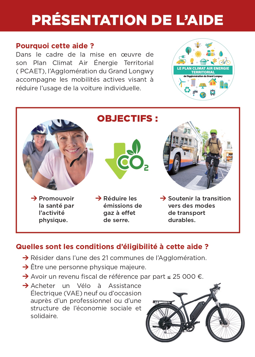 Dans le cadre de son Plan Climat Air Énergie Territorial (PCAET), l’Agglomération propose une aide pour l’achat de Vélo à Assistance Électrique (VAE) afin d’accompagner les habitants vers des déplacements plus respectueux de l’environnement.