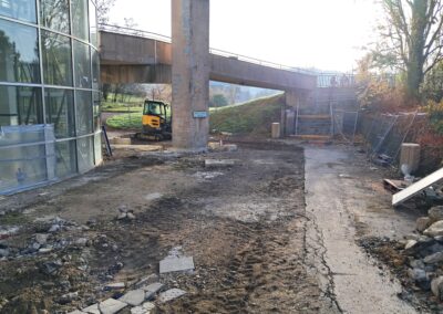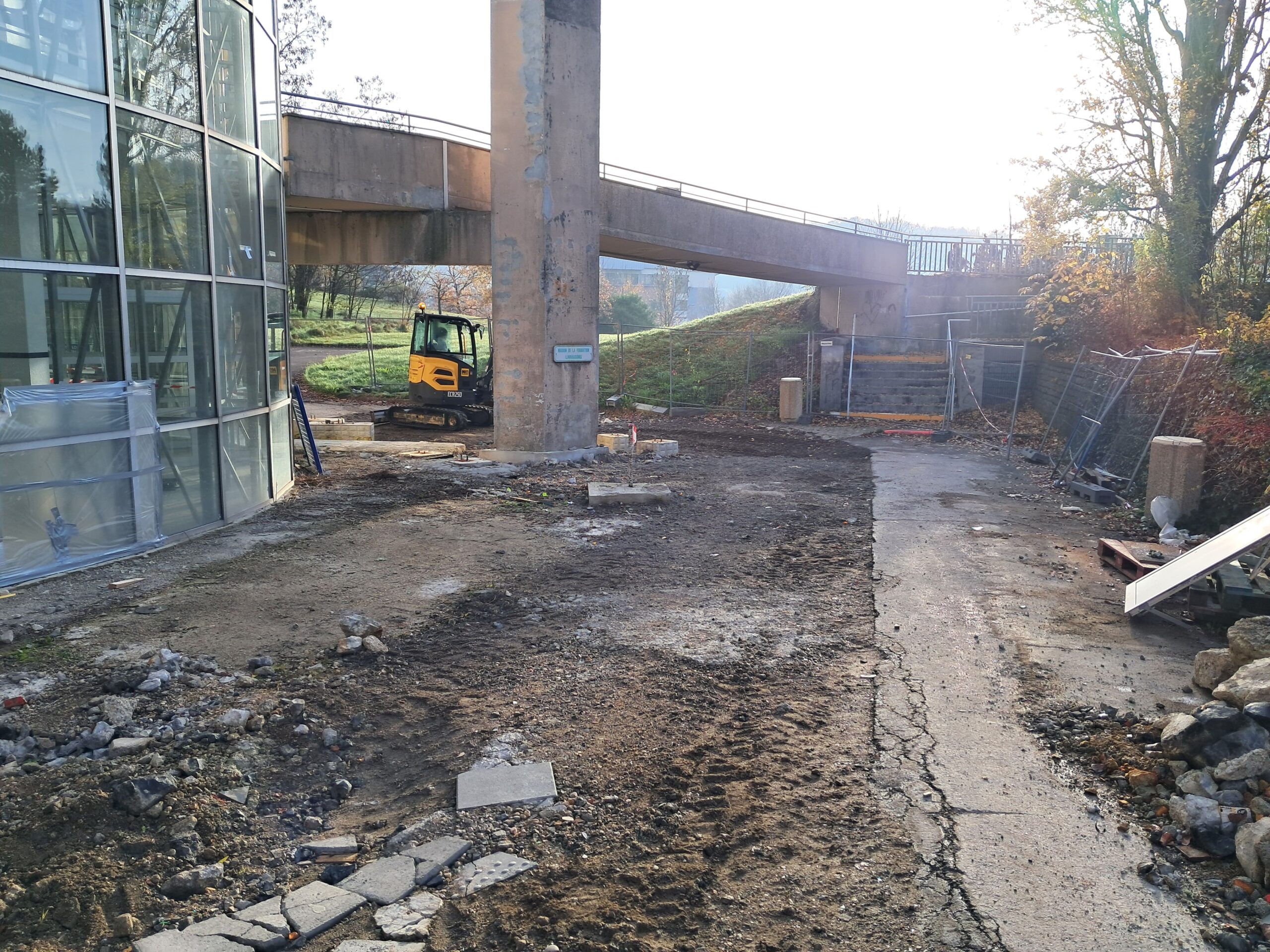 Après le démontage des structures métalliques d’étaiement provisoire, les travaux de VRD vont reprendre pour réaliser la route et les abords du rez-de-jardin du bâtiment.